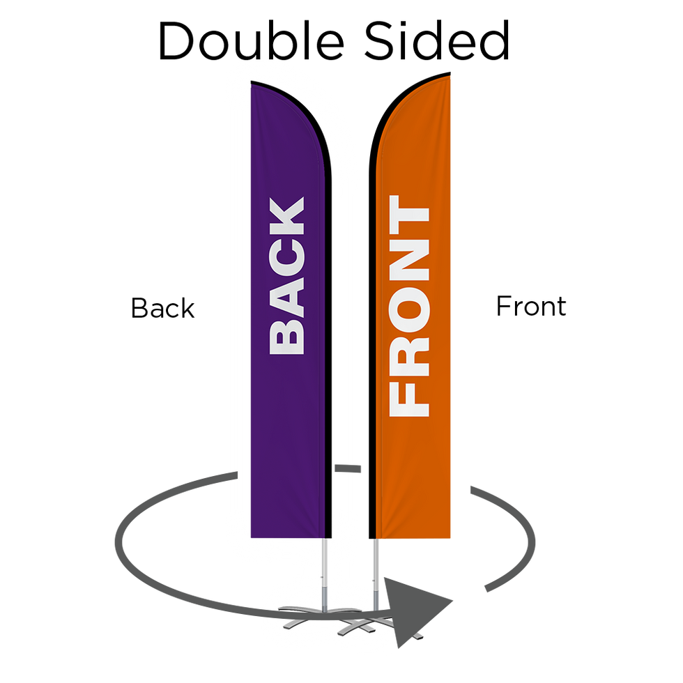 12ft custom feather flags on 3oz polyester with dye sublimation printing — double sided with vibrant, fade-resistant colors. Hardware included: choose Indoor Cross Base or Outdoor Ground Stake. Order from 1 to 10 flags — quantities: 1, 2, 3, 4, 5, 6, 7, 8, 9, and 10.