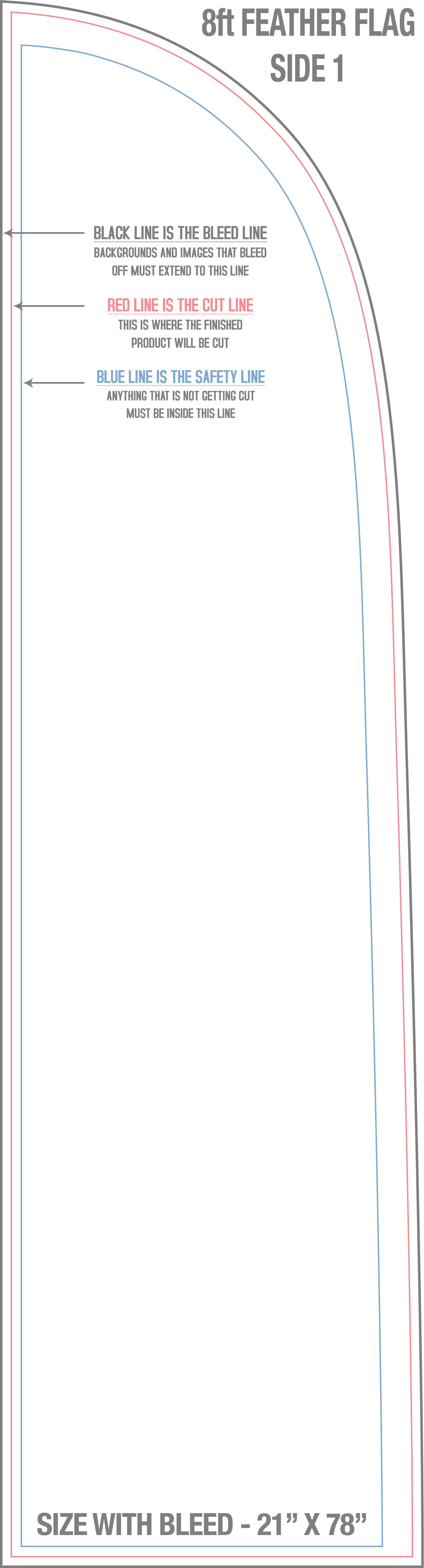 Our free feather flag templates are sized to the exact bleed dimensions used in production. Every template includes the black bleed line, red cut line, and blue safety line — and the distinctive feather curve at the top that gives these flags their signature shape.