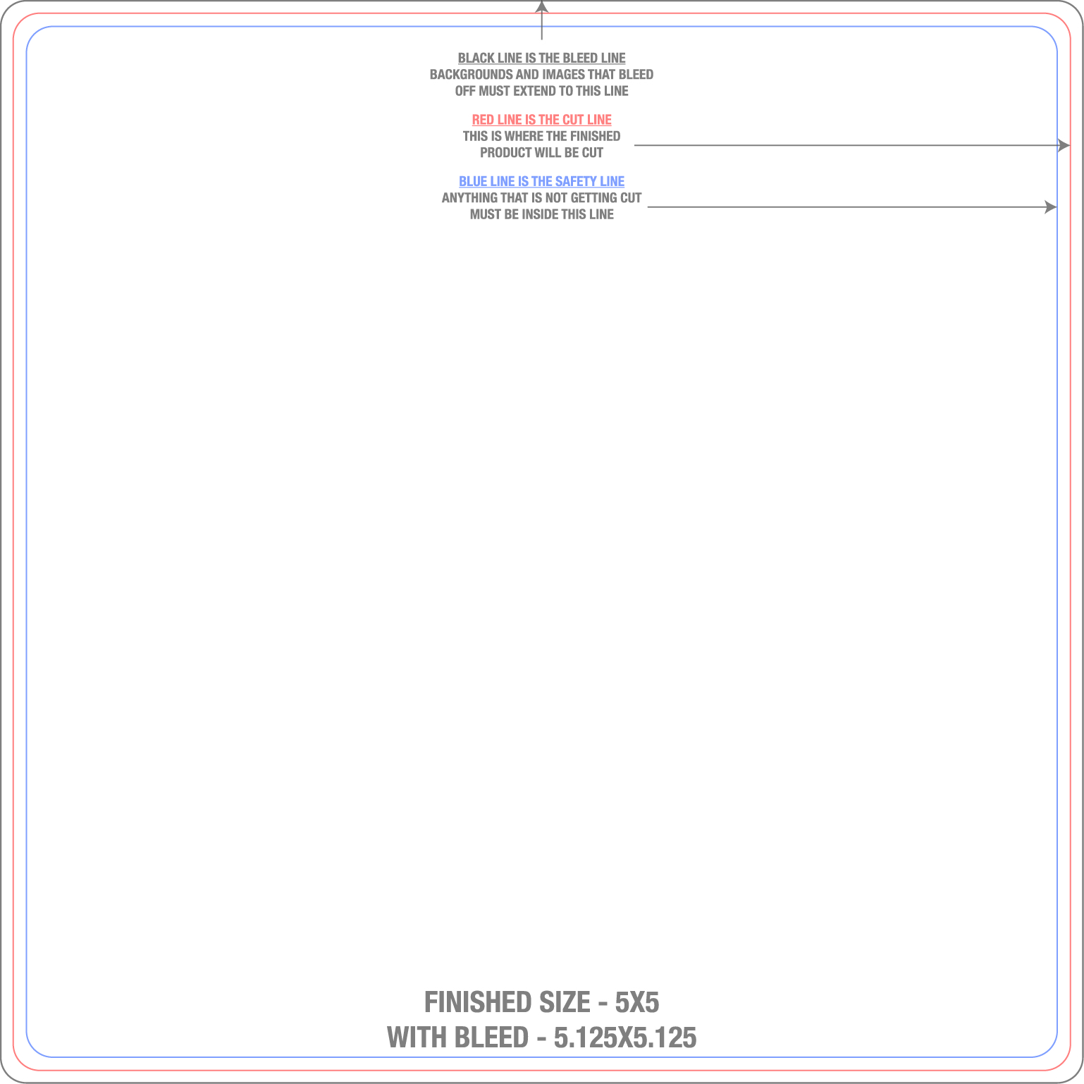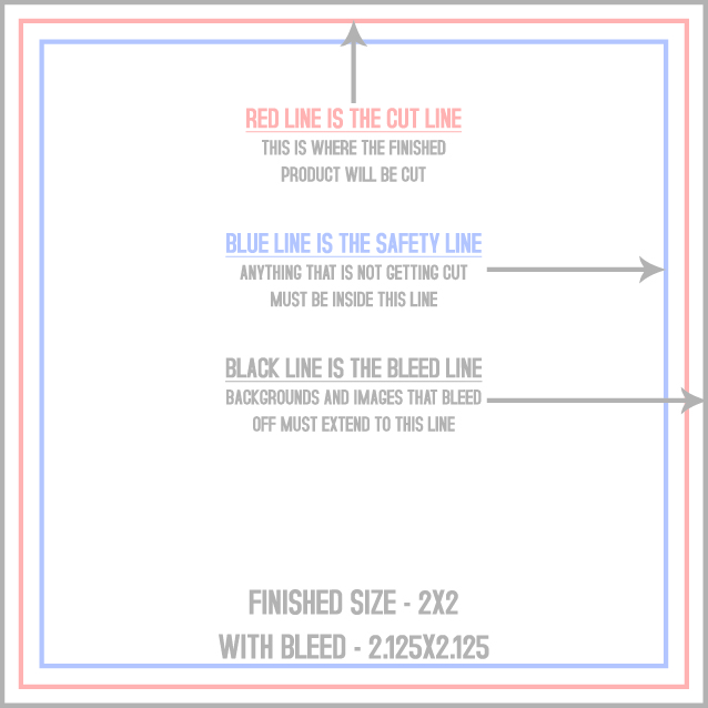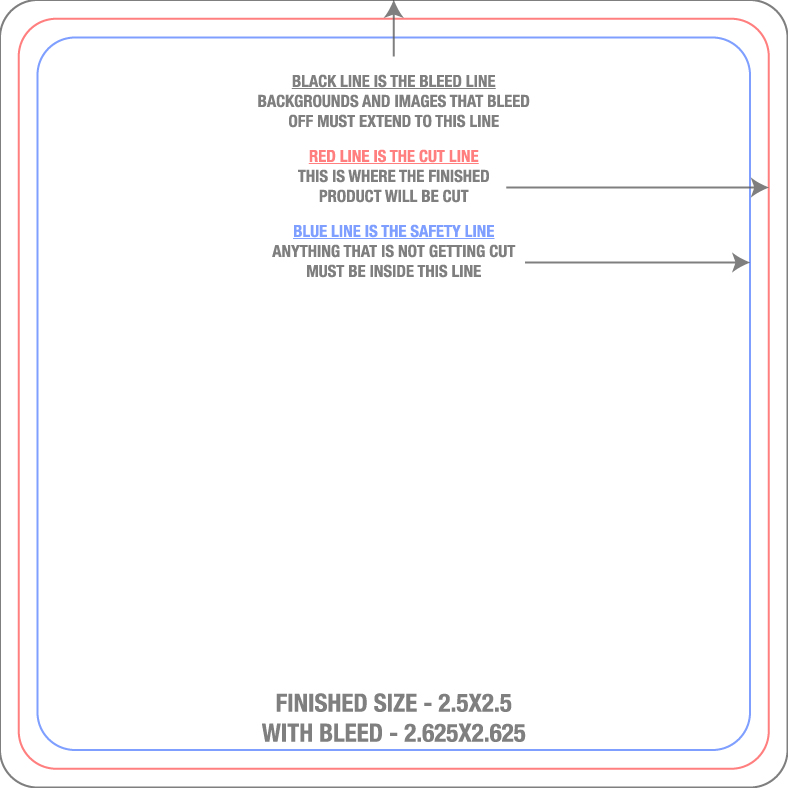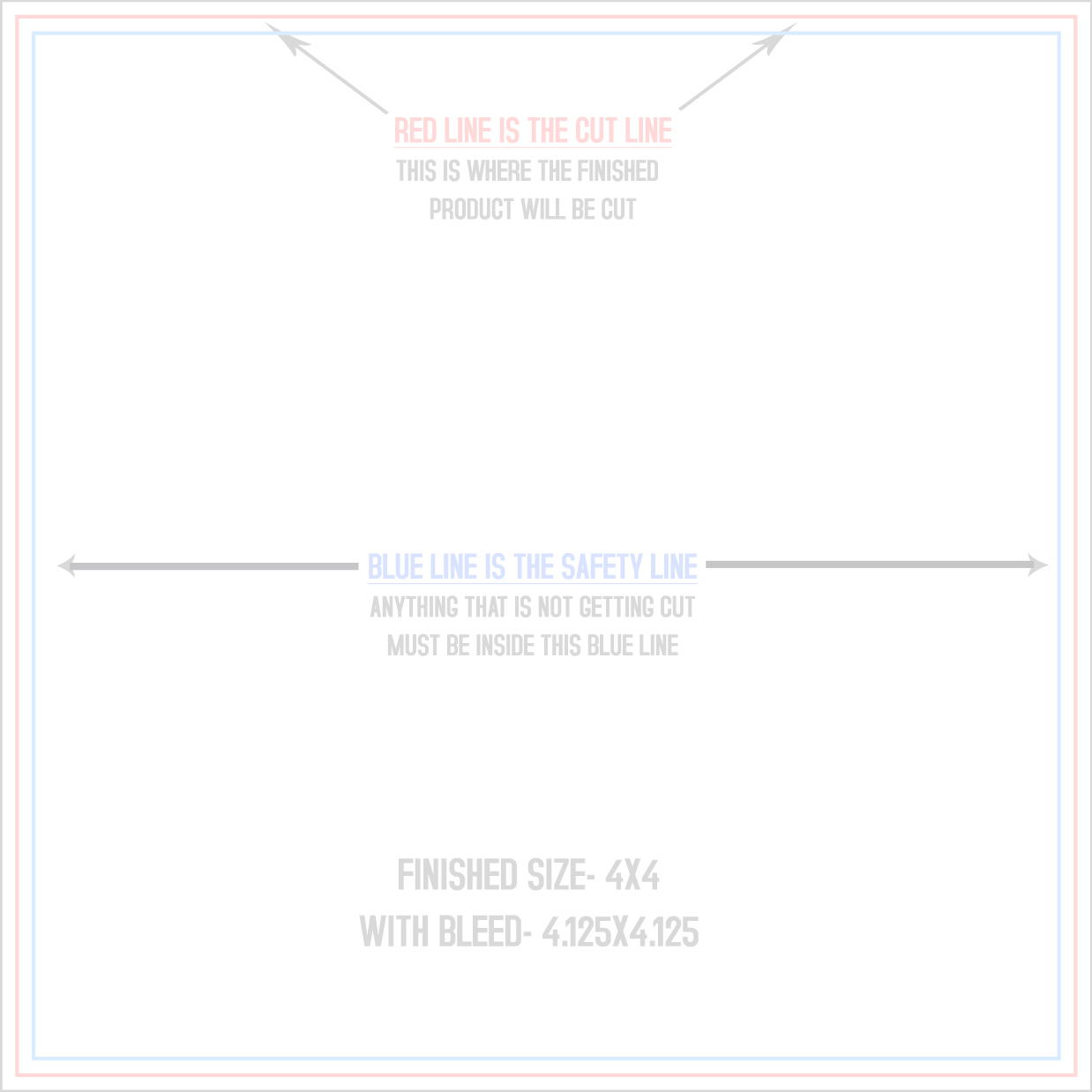 Our free sticker and roll label templates are built to the exact print dimensions used in production — including the 0.125" bleed on each side. Every template shows all three guide lines: the black bleed line, red cut line, and blue safety line.