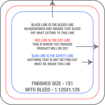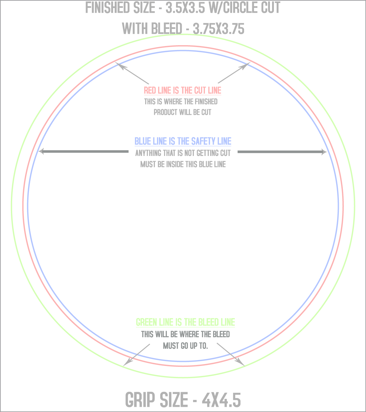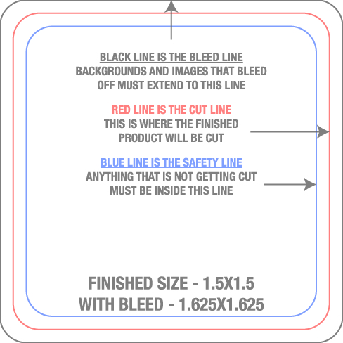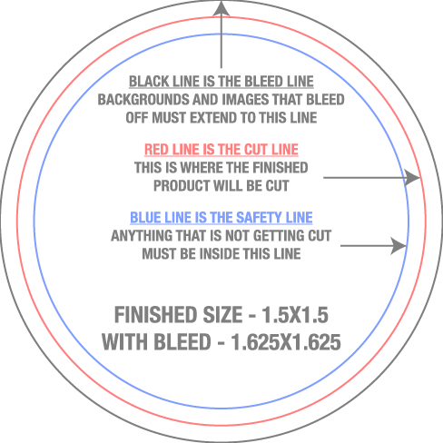 Choose your product type, shape, and size. Each template includes the black bleed line, red cut line, and blue safety line.